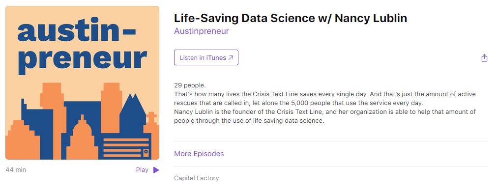 Technology is often blamed for this “false reality” and the recent rise in depression, suicide, and anxiety. However, what if we could use technology to actually help people in their darkest moments? Earlier this year I met an entrepreneur, Nancy Lublin, at SXSW and was so impressed with her and what she is doing. She is challenging leaders to think about the massive potential of technology and the data you could collect to help better serve the population. To demonstrate this she founded the non-profit Crisis Text Line and it now saves 29 people and talks to more than 5000 people per day (data as of April, 2019 – From Austinpreneur Podcast #18 Life-Saving Data Science w/ Nancy Lublin)