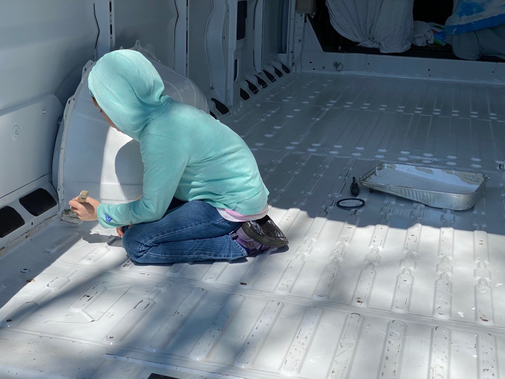 Beyond the windows, we used this time to completely strip the interior. The aluminum walls and shelves sold quickly, and we now wanted to clean and touch up any paint on the inside. The whole family helped with this stage.