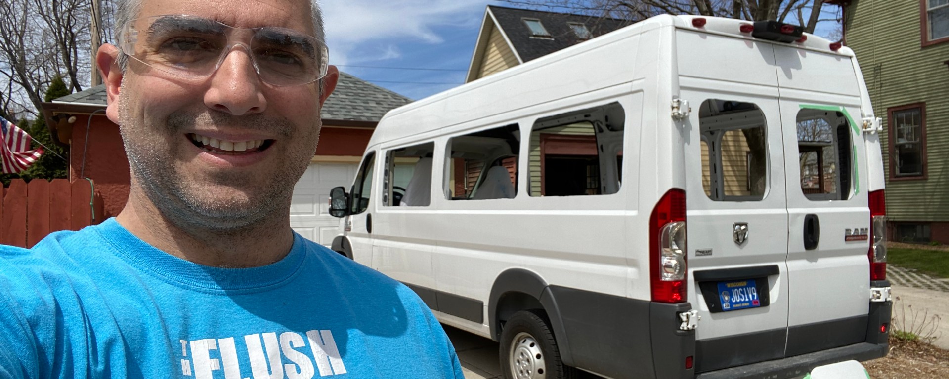 I am standing in the most expensive vehicle I have ever purchased with a die grinder. The van did not have any windows in the back, and we want a bright, open layout. The solution… cut big holes in the steel sides and install windows…